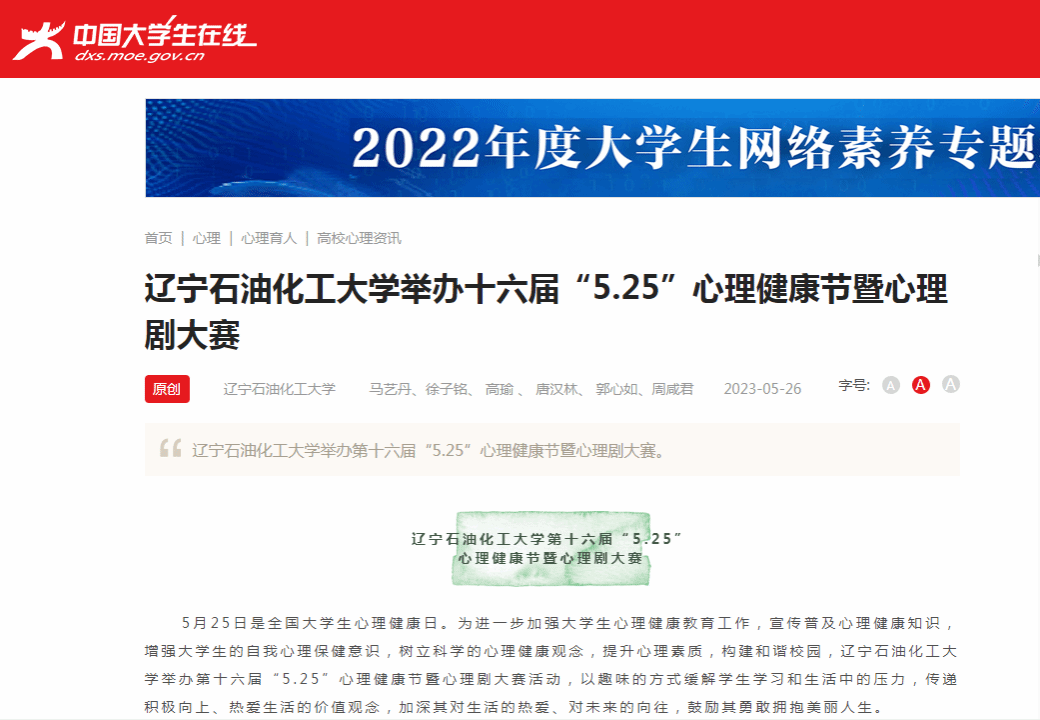 编者按:近日,中国大学生在线、学习强国辽宁学习平台、辽宁日报·北国号、人民日报客户端·人民号对我校举办十六届“5.25”心理健康节暨心理剧大赛进行了宣传报道。现将相关报道转载如下: