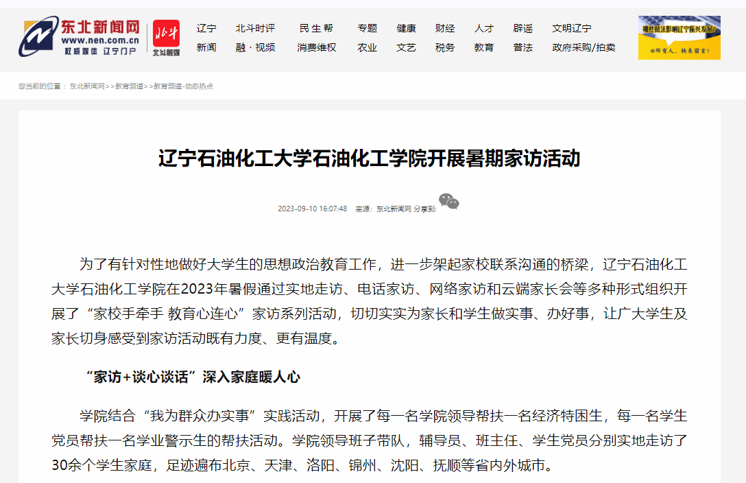 编者按: 近日,东北新闻网、抚顺日报微信公众号圈抚顺对我校石油化工学院2023年暑假通过实地走访、电话家访、网络家访和云端家长会等多种形式组织开展了“家校手牵手 教育心连心”家访系列活动进行了宣传报道。现将相关报道转载如下: