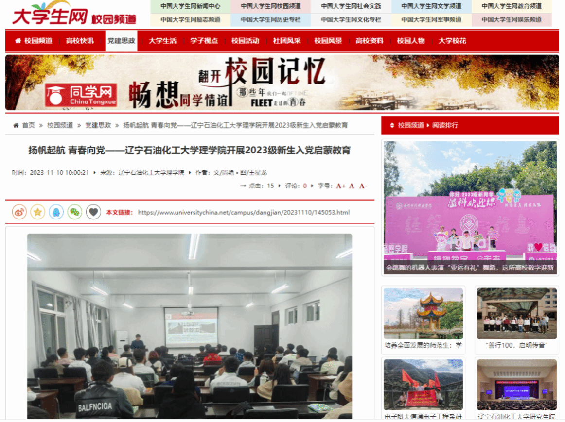 编者按:近日,中国大学生网对我校理学院开展2023级新生入党启蒙教育进行了宣传报道。现将相关报道转载如下: