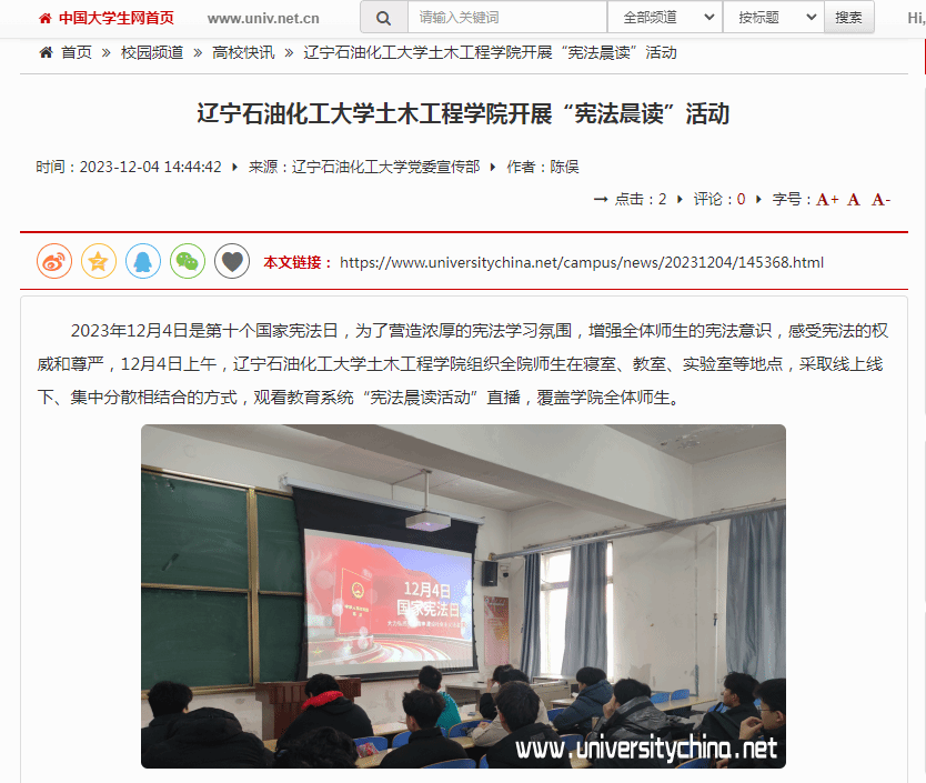 编者按:12月4日是第十个国家宪法日,中国大学生网、辽宁日报·辽望号、人民日报客户端·人民号对我校土木工程学院组织全院师生在寝室、教室、实验室等地点,采取线上线下、集中分散相结合的方式,观看教育系统“宪法晨读活动”直播,覆盖学院全体师生进行了宣传报道。现将相关报道转载如下: