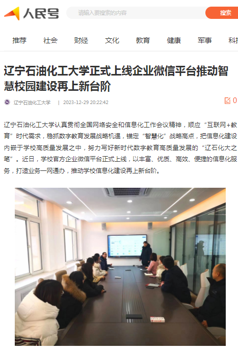 编者按:近日,学校官方企业微信平台正式上线,以丰富、优质、高效、便捷的信息化服务,打造业务一网通办,推动学校信息化建设再上新台阶。辽宁日报·辽望号、人民日报客户端·人民号、中国大学生网等媒体平台对此进行了宣传报道。现将相关报道转载如下: