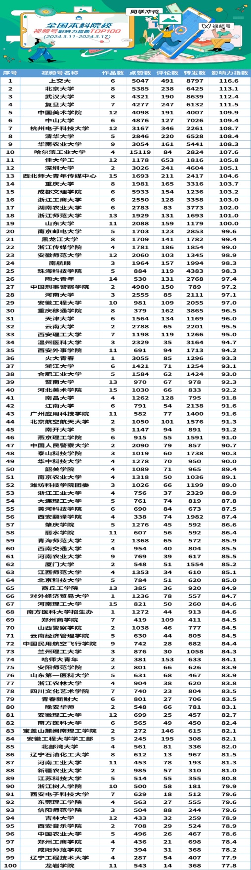 编者按: “全国高校视频号影响力指数”由中国青年报中青校媒发布,中青华云数据支持。2024年3月19日,中青校媒微信公众号发布全国高校(本科院校/职业院校)视频号影响力指数(2024.3.11-2024.3.17),我校成功上榜。现将相关报道转载如下: