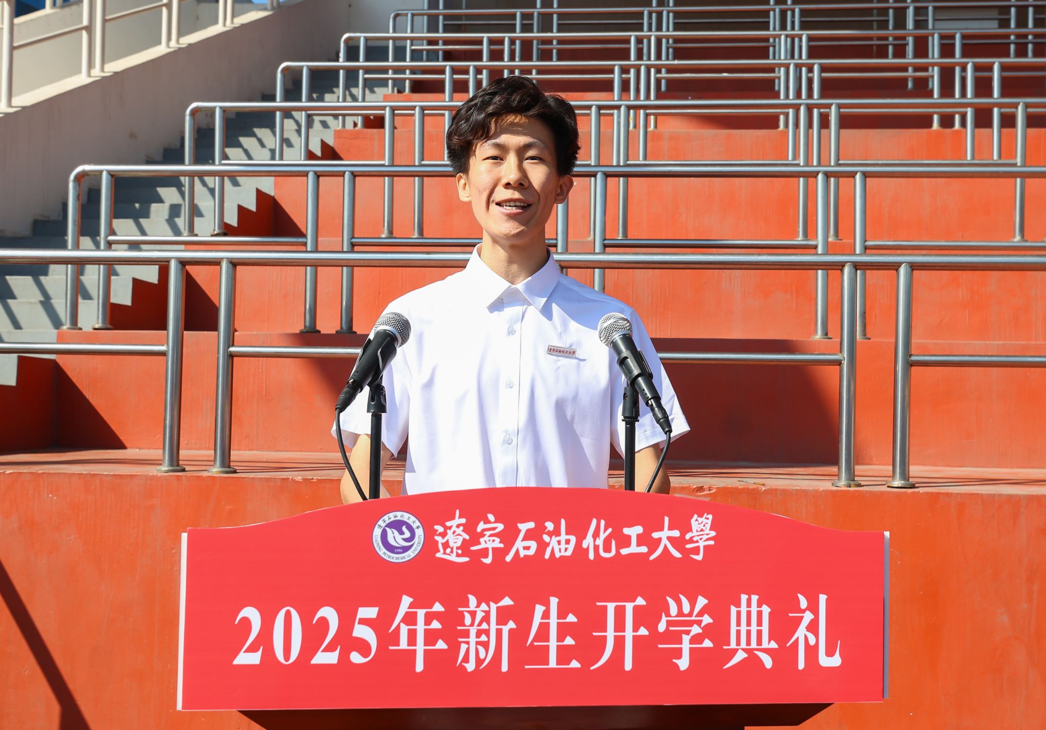 学生代表理学院物理学专业2025级研究生战禹诺、石油化工学院化学工程与工艺(卓越)专业2025级本科生张艺骞依次上台发言。他们表达了对大学生活的美好憧憬和立志成才的决心,表示将不负韶华,以开拓创新为笔、奋发有为作墨,续写辽石化大的辉煌篇章。