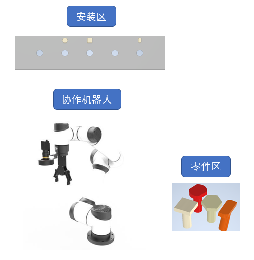 四种形状的零件随机放置在零件区且存在不同程度的倾斜。参赛者需要编制程序,使得机器人能够识别出安装区标志物的形状,并在零件区(图3)找出对应形状的零件,依次抓取并安装至安装区标志物对应的孔中,由准确识别与安装零件数量、安装完成时间来进行参赛者的打分。